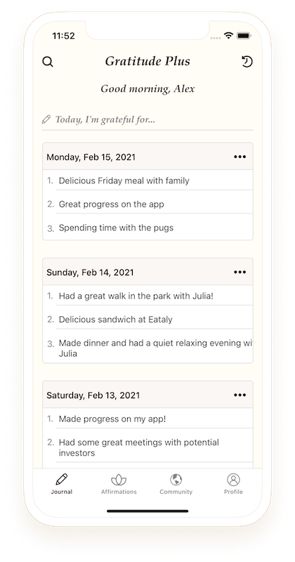 Studies show that the simple act of writing down what you're grateful for can have a significant impact on your health and happiness. Gratitude Plus helps you do this with the support of community.